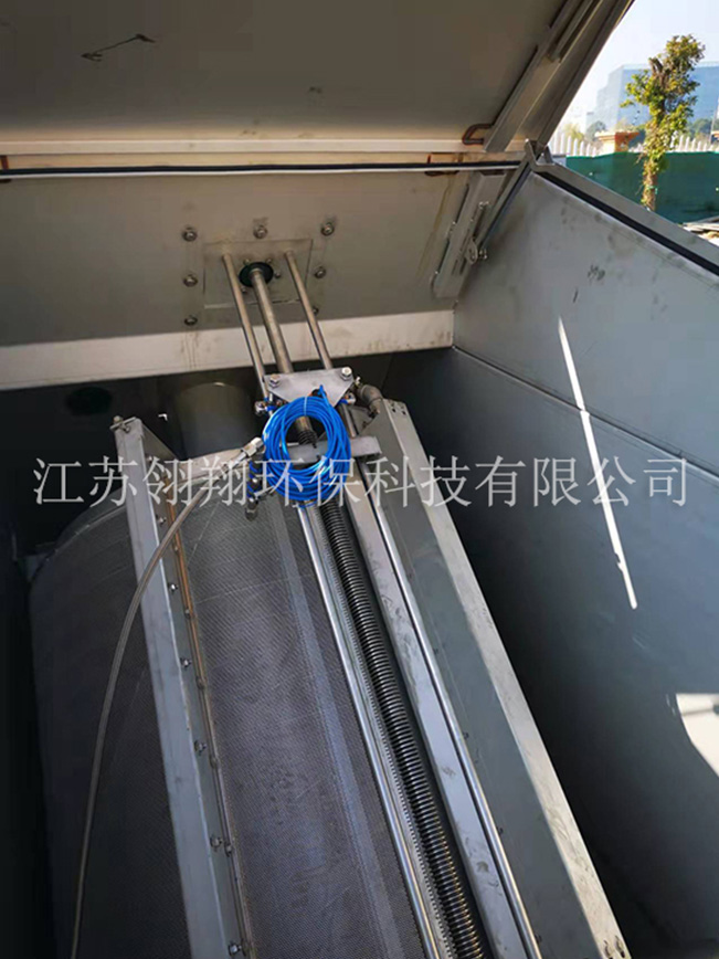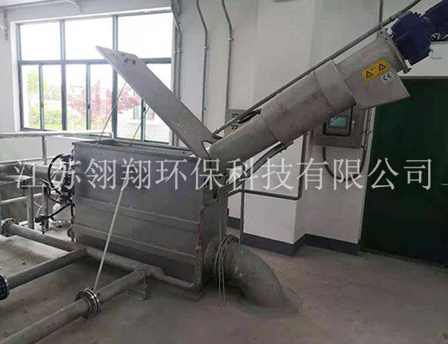 細(xì)格柵過(guò)濾裝置是安裝在不銹鋼箱體中。污水從開放式的篩筐頂端流入,然后穿流過(guò)篩網(wǎng)??蓪⒅睆酱笥?mm以上的固含物(短纖維,沉淀物質(zhì)、懸浮物質(zhì)及飄浮污)截流分離出來(lái)。還另外通過(guò)渣刷和洗刷棒的清理,將濾渣扔入安裝在篩筐內(nèi)中央的料斗之中,然后通過(guò)一中央絞龍送入密封式的上升螺管內(nèi)。濾渣則在螺管內(nèi)被進(jìn)一步傳送,壓榨,脫水,后落到有機(jī)柵渣渣斗內(nèi)。壓榨脫水后的濾渣固含量高達(dá)40%。
